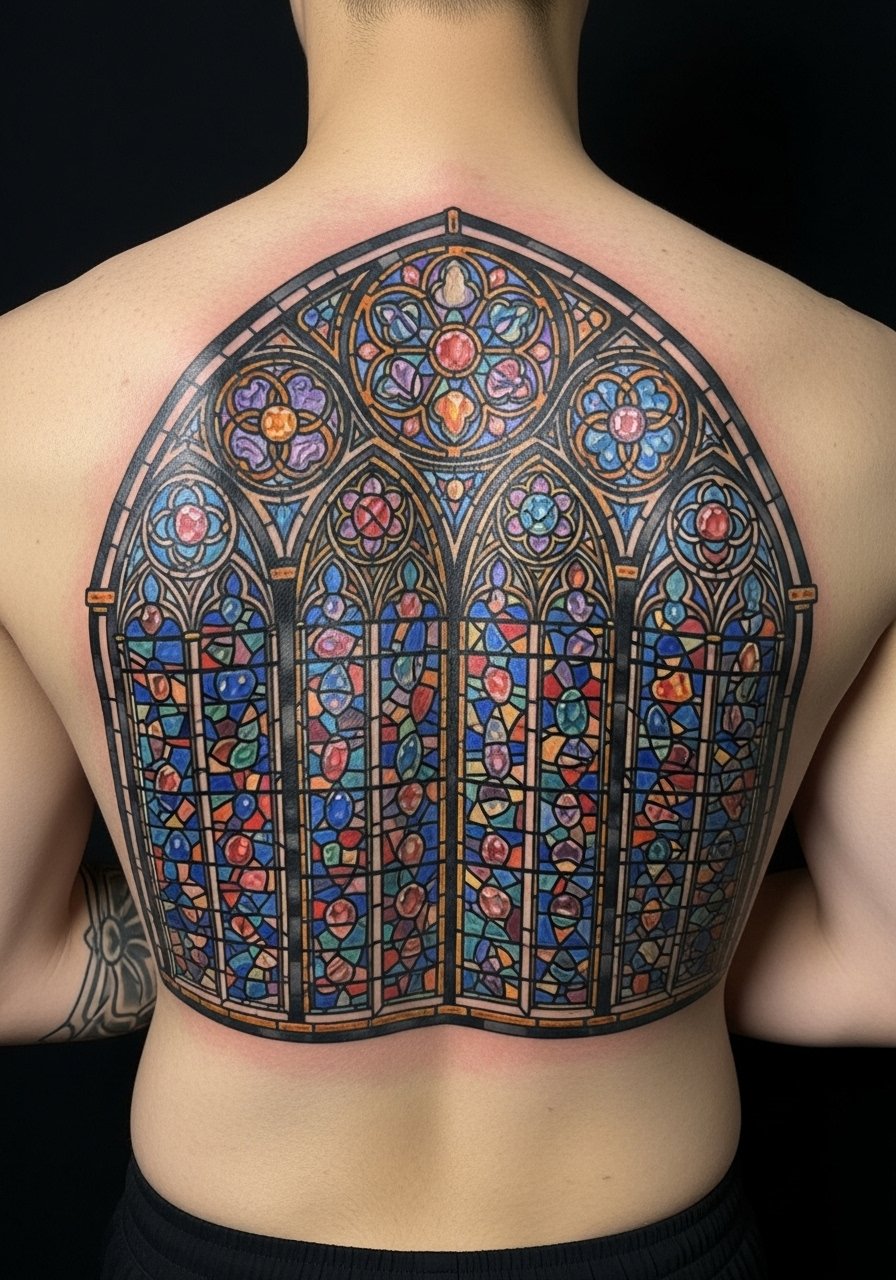 I fell for stained-glass because it mixes color with heavy black outlines—perfect for Gothic vibes. On the back, an arched window reads architectural and cinematic. Expect multiple sessions and mid-range pain. Healed color looks jewel-toned but slightly muted compared to fresh ink. Artists who can do clean color separation and heavy lead lines are ideal; otherwise, color bleeds. Common mistake: too many tiny panes—scale matters. Keep panels larger so the lead lines stay crisp. This piece feels timeless and churchlike without leaning religious unless you want that symbolism.