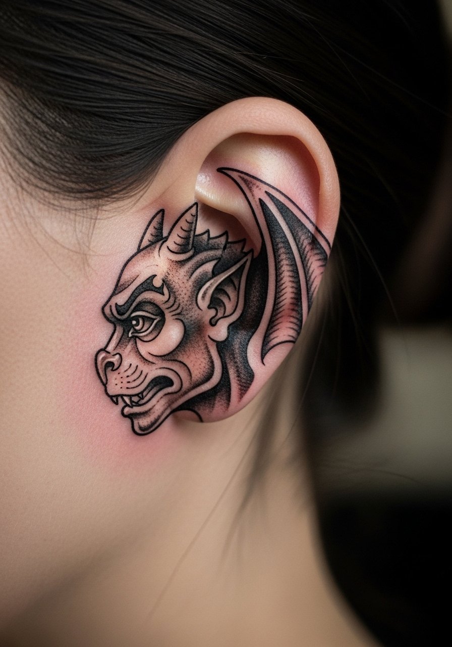 Behind-the-ear gargoyles are a stealthy Gothic choice. I chose this to add a mischievous accent I can reveal with my hair. Expect sharp pain—thin skin and bone proximity amplify sensation. Healed detail can soften quickly, so keep the design bold and avoid tiny textures. Healing needs careful moisture control; hair oils can irritate the area. A common mistake is over-detailing; behind-ear tattoos benefit from simplified silhouettes. Ask for a bold outline and clear eye or horn elements so the image reads from a short distance.