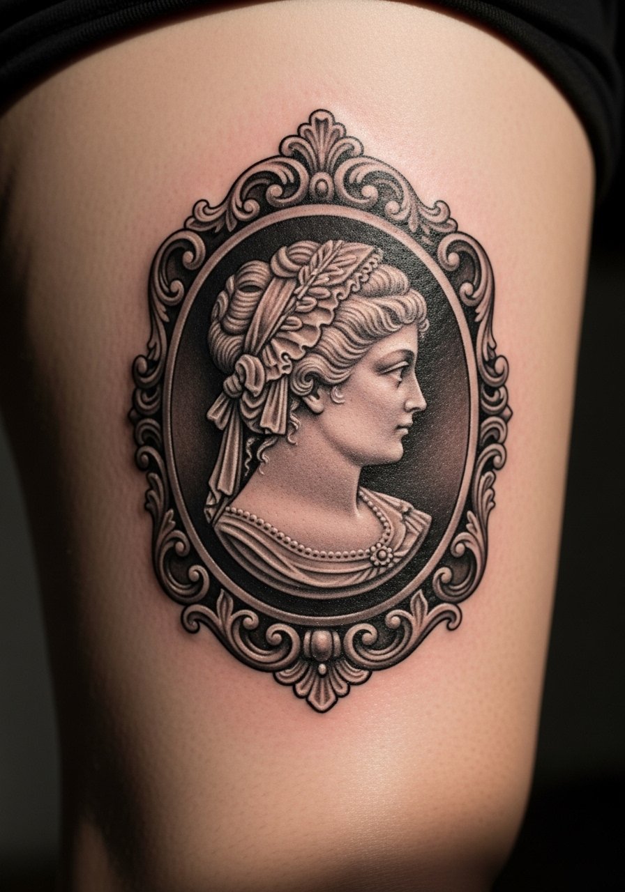A mourning cameo on the thigh reads like a keepsake. Thighs handle shading and look great healed. I picked this for a piece that’s intimate but large enough for facial detail. Pain is manageable and sessions are comfortable since you can lie down. Micro-realism ages depending on line fineness—faces need enough contrast to stay defined. Common mistake: tiny facial features at small scale; they often blend. Ask for slightly stronger shading cues and a clear oval frame to preserve the cameo look as it settles.