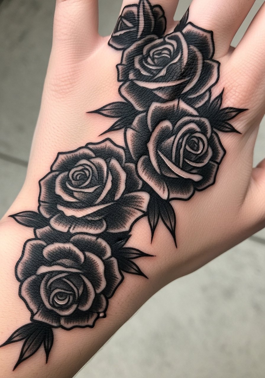 Hands scream commitment. I chose a black rose cluster because roses read Gothic and hands emphasize the drama. Expect high pain and faster fading—hands get sun, washing, and abrasion. Healed black tends to hold shape but will lighten; touch-ups are common. Artists often advise simplified shapes and heavy contrast for longevity. Common mistake: tiny details between knuckles; they rarely survive. If you want a bold, meaningful piece, go for clear silhouettes and heavy black fill to anchor the design.