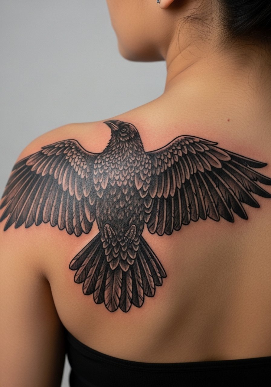 I love ravens for their Gothic symbolism and motion. Shoulder blade offers a canvas for wing spread that looks powerful healed. Pain is moderate; sessions are tolerable. Feather detail can soften; ensure the artist uses distinct contrast for the wing tips and body. Common mistake: too many micro-feathers—simplified feather groups read better long-term. This design pairs well with script, moons, or filigree frames for a layered Gothic bodypiece.