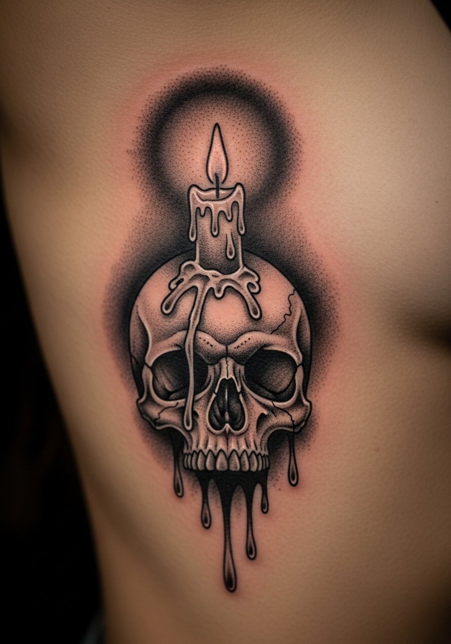 Skulls with melting candle wax are Gothic staples. I loved the way the drips create motion. Rib side is painful, but the elongated shape suits wax flow. Healed high-contrast shading keeps the skull readable; tiny cracks can soften so bold shadow choices help. Avoid micro-hatching that will blur into gray patches. Common mistake: making the wax too detailed; keep the silhouette clear. This reads moody and meaningful, especially when paired with script or roses.