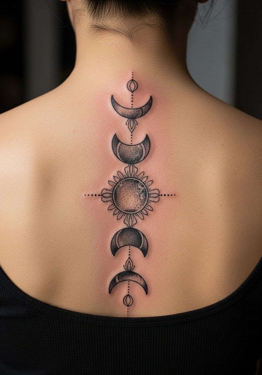 I went for moon phases along my spine because the vertical flow feels ritualistic. Spine tattoos are painful near bone but look powerful. Dotwork stippling ages nicely if the artist spaces dots correctly—too tight and it becomes a gray block. Expect several short sessions so the artist can manage comfort. Common mistake: overloading filigree with tiny lines next to stippling; let negative space separate textures. This piece feels timeless and symbolic—great for someone drawn to ritual, cycles, and Gothic ornament.