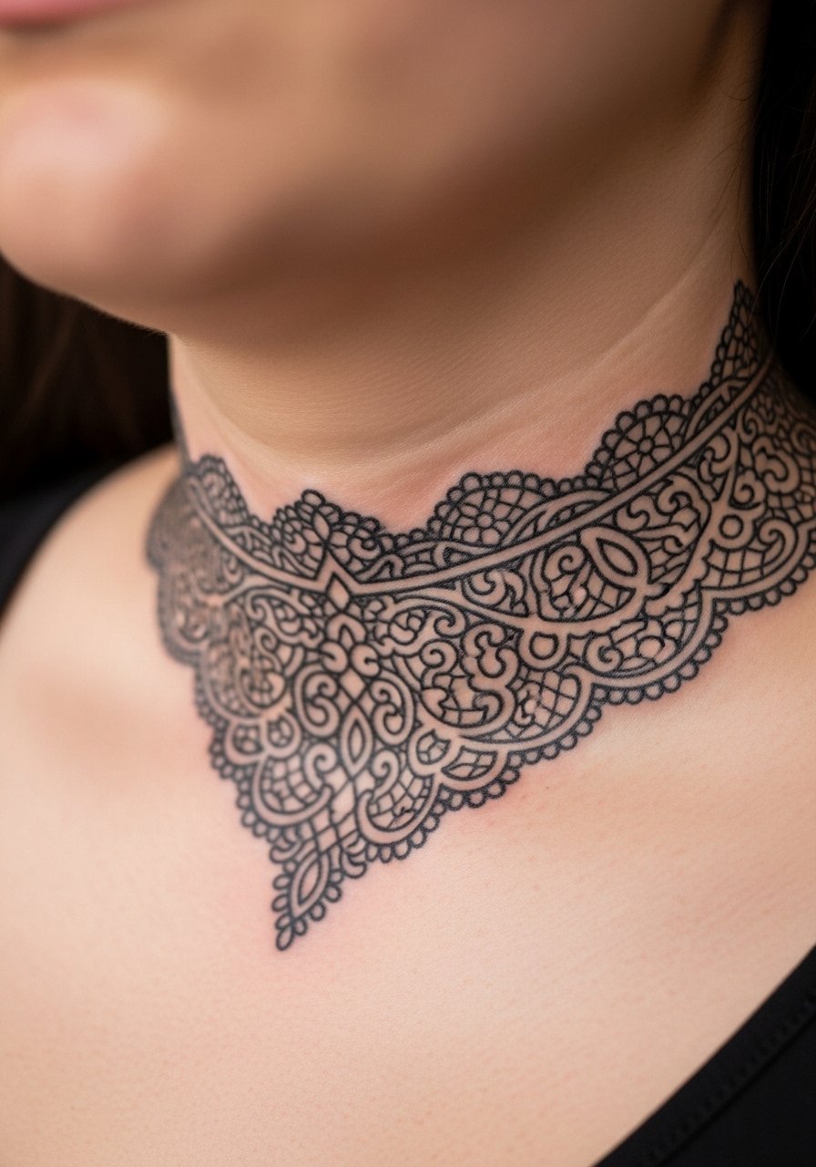 Neck lace is a visible commitment. I picked a collar lace to frame the face like vintage jewelry. Neck pain is high and healing requires avoiding friction from collars and jewelry. Fine lines settle quickly on the neck, so ask the artist to slightly thicken the key pattern lines. Common mistake: over-detailing in a small neck band—designs need breathing room. This is a bold, elegant Gothic look that reads delicate but demands care and confidence.