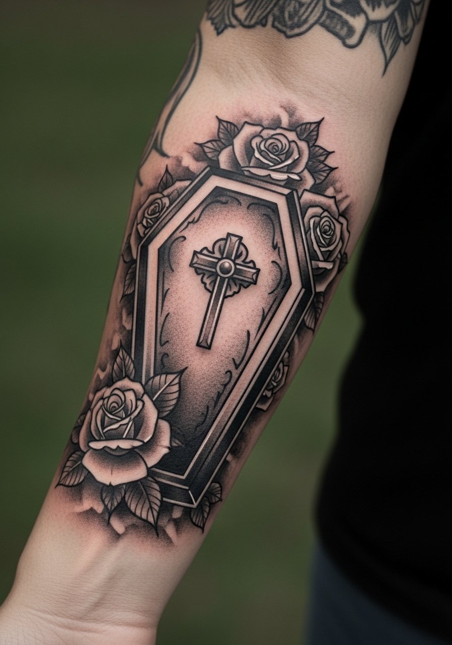 An inner-forearm coffin paired with roses works great for sleeve narratives. I used it as an anchor piece and then added filigree to connect. Forearm pain is fair, and healing is straightforward. The roses give softness while the coffin gives motif. Common mistake: isolating the coffin without flow—design should follow the arm’s natural lines. This placement stays visible and meaningful, and ink here tends to age predictably if you protect it from sun.