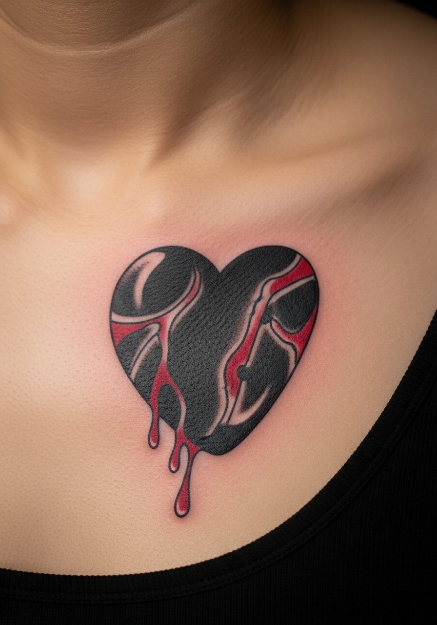A bleeding heart centered on the sternum reads like an emblem of weight and dedication. I chose it because chest placement offers central symmetry. Pain is intense, so plan for breaks. Reds can fade faster; healed color will be subtler than fresh ink. Common mistake: overly fine blood lines—they often blur. For longevity, request bold outlines and saturation in key shadow areas. This piece feels theatrical and intentionally Gothic.