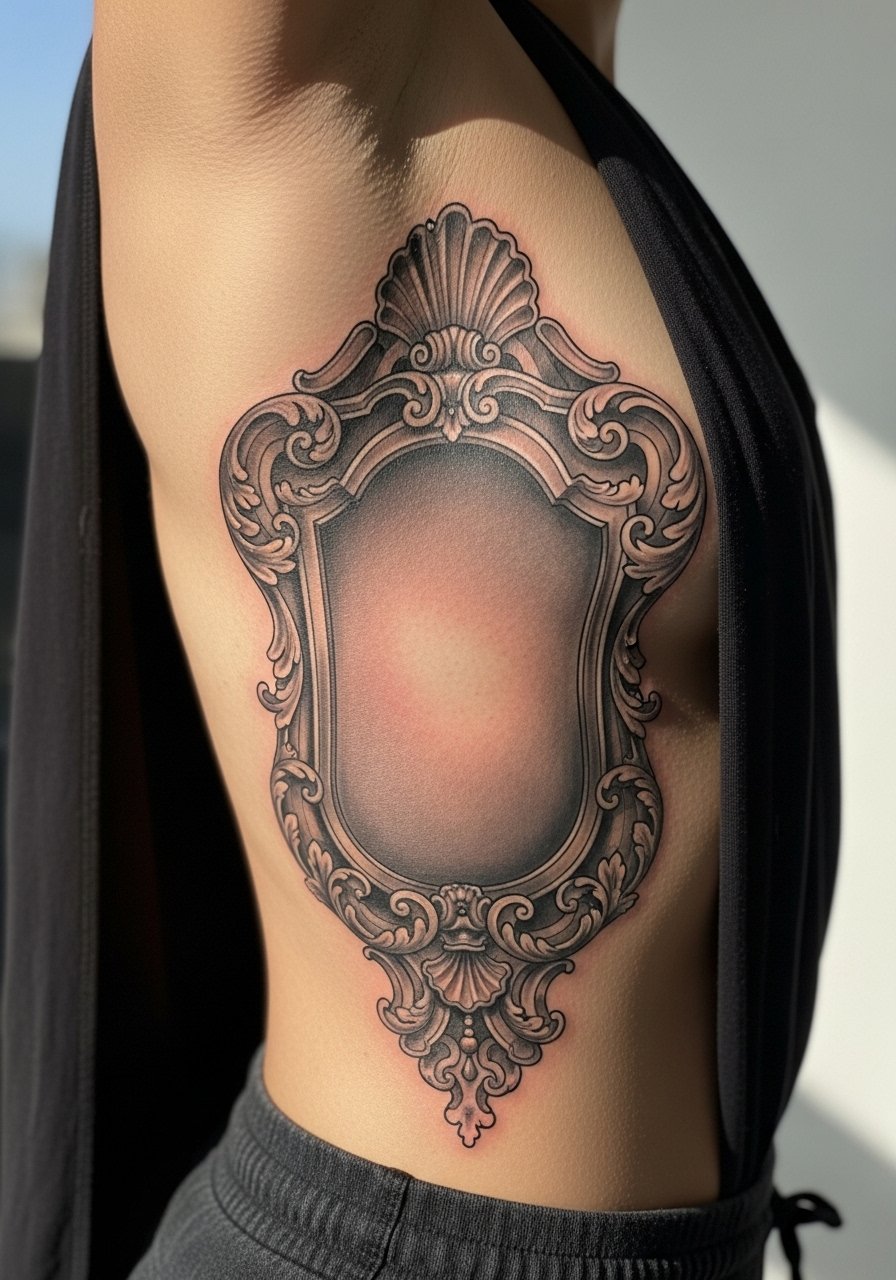 A decorative mirror frame frames the idea of reflection. I used it to surround a future portrait—frames work as standalone Gothic art too. Ribcage placement is painful but the frame’s sweeping curves suit the torso. Details can flatten; ask for stronger negative spaces so scrolls don’t merge. Common mistake: tiny ornamental knots—they fade into indistinct texture. A bold frame ages into a clear silhouette, creating an antique look.