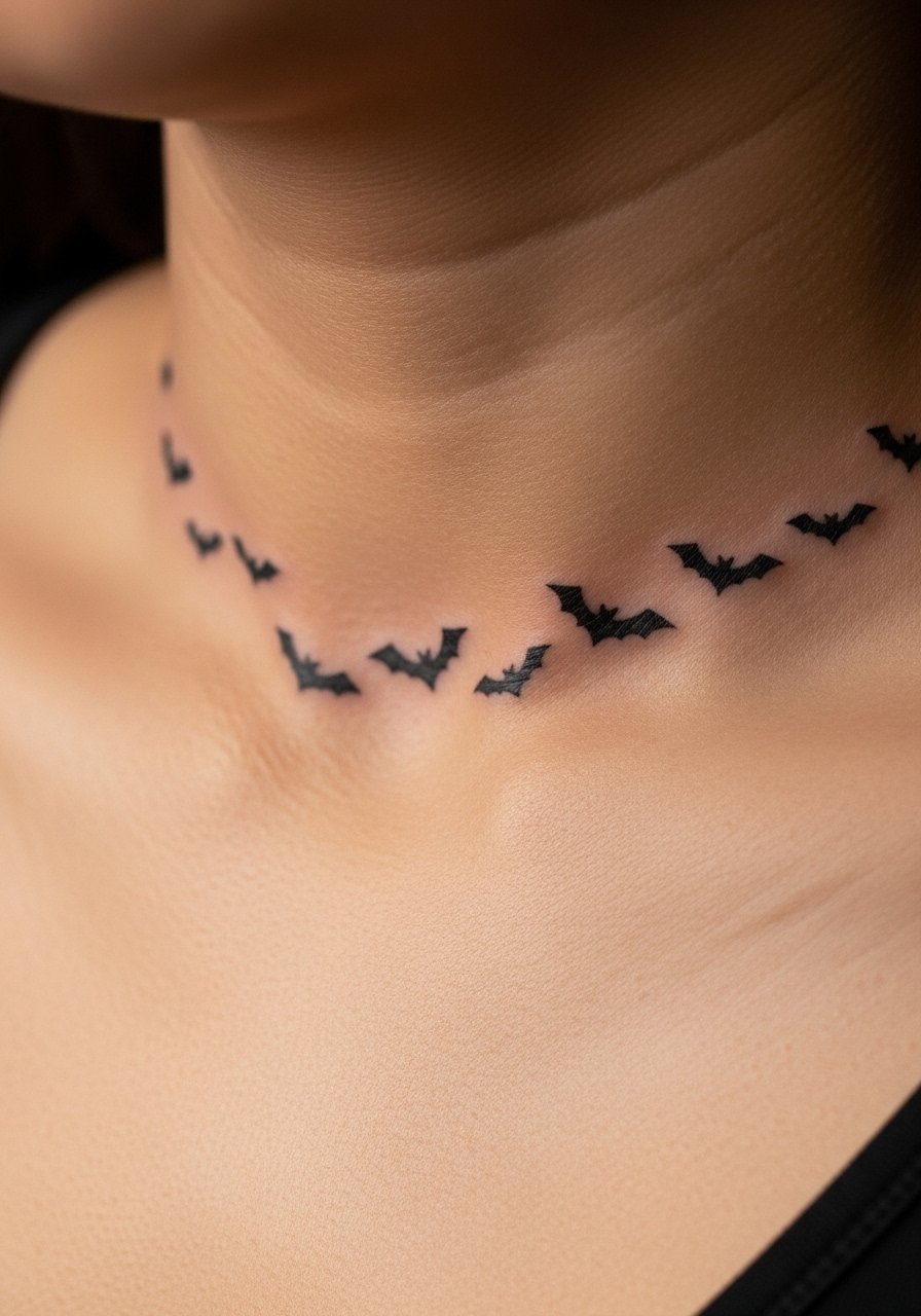 A flock of bats feels cinematic. I like collarbone placement because the line follows the bone and fabric reveals it. Pain is moderate. Solid black silhouettes fare well over time—little detail is needed. Common mistake: tiny wing notches; they can wash out. For a timeless look, pick varied bat sizes and spacing so the flight reads as movement even when healed.