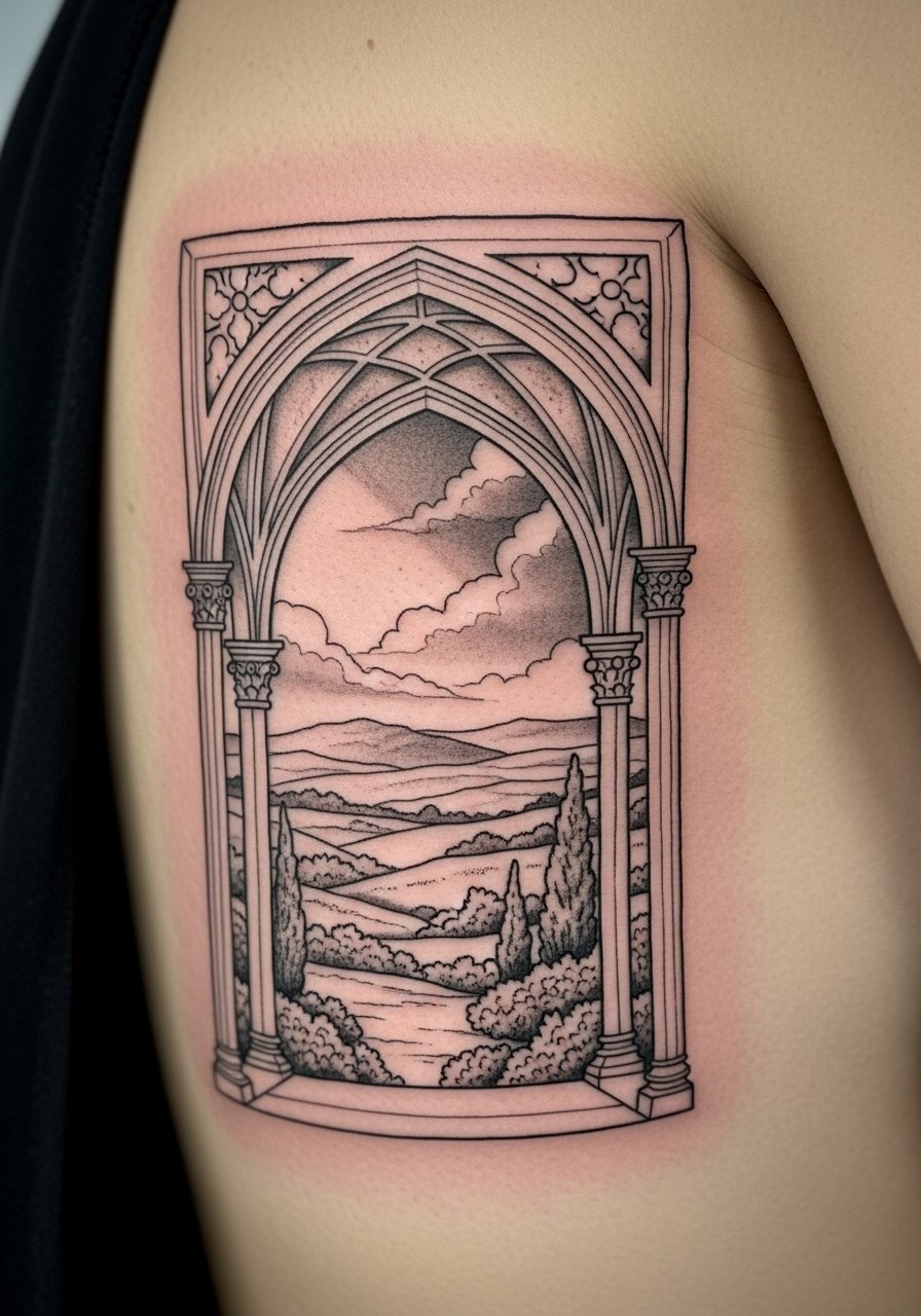 An archway scene evokes solitude. I chose a cloister to suggest shelter and history. Side rib placement allows vertical composition but is sensitive. Architectural linework needs proper spacing so columns don’t blur together. Ask for strong anchors—arches and pillars—to maintain clarity. Common mistake: over-texturing the background; simple washes keep the arch the focal point. Healed, this piece keeps its storybook mood if protected from sun.