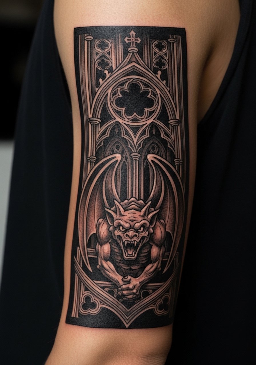 A gargoyle panel anchors a sleeve with Gothic lore. Outer arm placement is forgiving and visible. Pain is moderate and sessions can be split. Bold shading and strong outlines preserve the gargoyle’s personality as it heals. Common mistake: surface textures that read like noise once healed—prioritize silhouette and major shadow masses. This fits collectors who want cohesive Gothic storytelling across the arm.