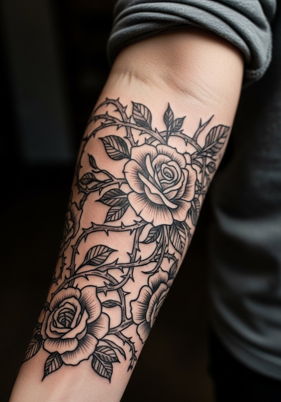 I saw a version of this at a shop and the contrast pulled right away. Inner forearm is forgiving for detail. Pain is moderate, a 3 to 4 for most. A half-sleeve usually needs two to three sessions. Ask for strong negative space to keep the roses readable at two years. New artists often make the mistake of using too many tiny dots in shadow areas. They flatten into gray patches after healing. Tell your artist you want bold silhouettes and textured fills. Aftercare matters because forearms get sun. Invest in a good tattoo SPF stick for long-term color protection.
