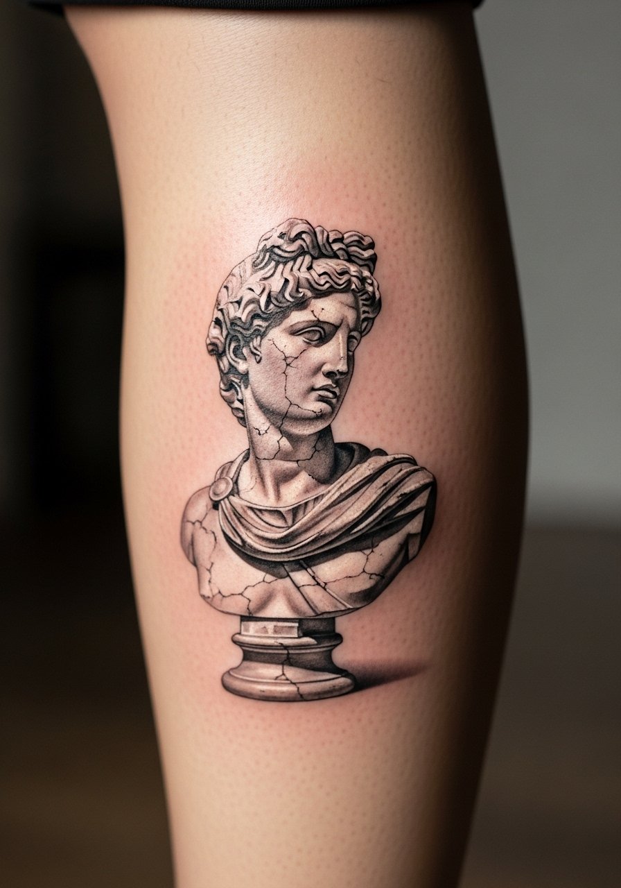Most marble statue pieces read like relics when done small and detailed. The calf feels like an ideal canvas because it stretches. Pain at the calf is usually a 4. Sessions can run two to three hours for tight detail. Tell your artist to mimic cracked stone textures and to leave soft highlights as skin tone. I warn people that tiny hairline cracks drawn too fine will vanish after a year. The smart move is to ask for slightly exaggerated contrast in the first session so the piece keeps depth when it settles. Heals in two weeks but shows its full character around six months.