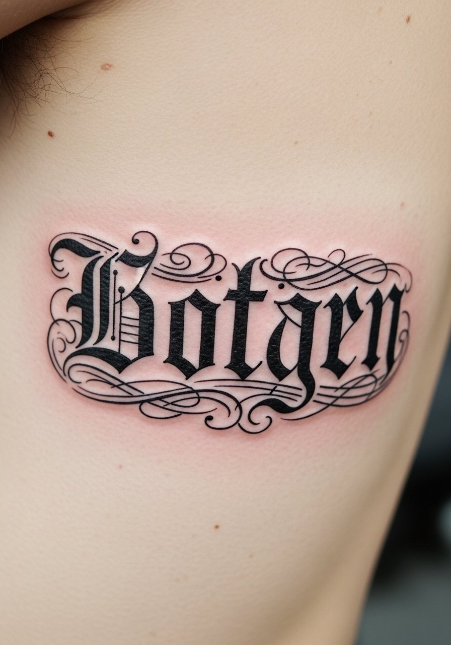 I first saw a script like this as a memorial. The rib placement makes names feel private. Pain can spike to 7 during lettering. Short words take 30 to 60 minutes. Tell your artist which historical letterforms you like, and bring examples of letter weight. A common mistake is using fonts intended for print without adjusting for skin movement. Letters can warp across ribs if the spacing is too tight. After a year, a slightly heavier baseline will read cleaner than ultra-fine calligraphy. Consider stretch tests with your artist when sitting for the stencil.