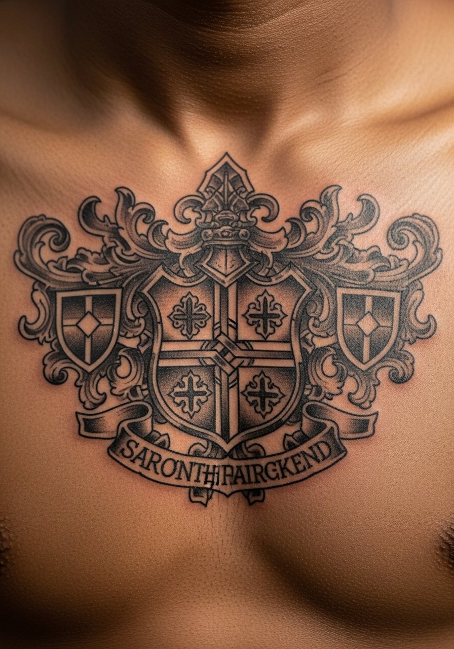 I love how a chest crest reads like identity. This placement is great for symmetrical designs. Expect a 5 out of 10 pain rating near the sternum. Medium-sized crests usually take one to two sessions. Ask your artist to define heavy outer borders and simplified inner motifs so the crest stays readable five years out. A mistake I see is overfilling crests with tiny lettering. That text becomes blotchy as the chest moves. If you want later additions, leave room under the crest. Heals solidly if you avoid chest-stripping garments the first two weeks.