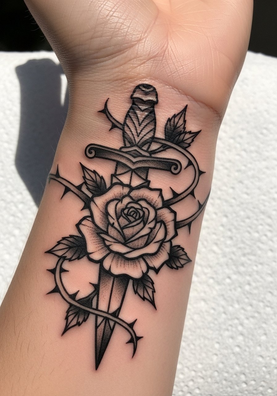 I first saw this motif on a concert poster and later on real skin. The wrist stings more than the forearm, about a 5 out of 10. A small dagger piece is a compact 60-minute session. Ask for slightly thicker outlines and limited small shading near the blade. People often request razor-fine thorns that blur into a dark line after healing. If you want the knife edge to stay visible, tell the artist to keep some highlight gaps. For this placement, I use a thin coat of Aquaphor the first three days, then switch to a fragrance-free lotion after day four.