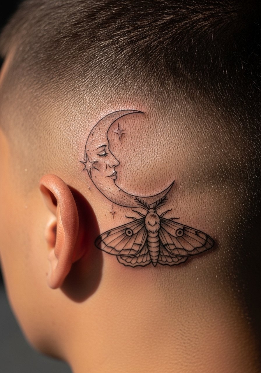Behind the ear reads intimate and a little secretive. I recommend moth motifs for a gothic whisper. Pain is sharp and quick, a 6 out of 10 in that spot. Tiny tattoos work well because the area is small. Tell your artist to keep the antennae slightly heavier so they remain visible after settling. One mistake is asking for extreme micro detail in a hair-thin area. The moth's texture will simplify as it heals. Expect the true look to emerge around three months. For styling, this placement pairs well with nape pieces later.