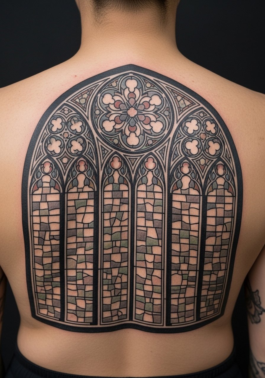 I once watched an artist lay out a cathedral window as if planning stained glass. Back pieces are marathon sessions. Pain fluctuates across the scapula and spine, average 6 out of 10 when they reach the center. Expect multiple sessions. Tell your artist you want bold leading lines and selective color panels, not a full rainbow every pane. A common error is over-detailing small sections that blend over time. With strong contrast and planned negative space this idea keeps its drama for years. Plan healing breaks and hydration between sessions.