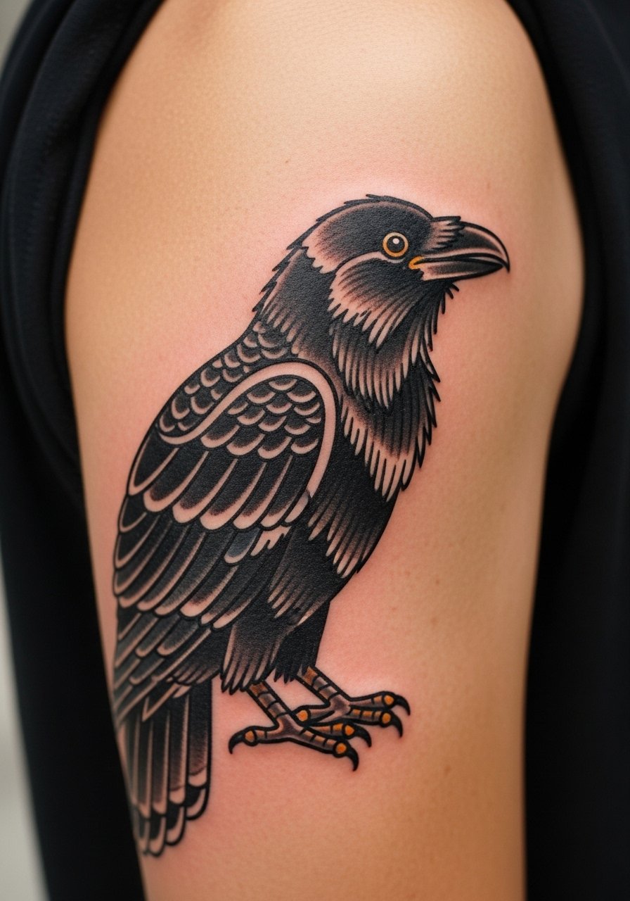 16. Neo-Traditional Raven on Upper Arm
