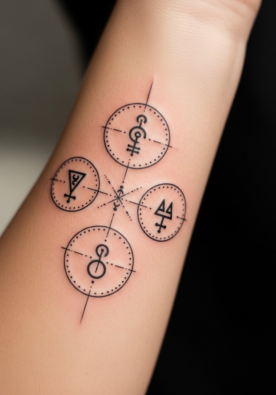 I recommend alchemy sets for people who want modular tattoos. The inner forearm tolerates frequent viewing. Pain is low to moderate, about a 3. You can do several small symbols across a single session. Tell your artist you want crisp geometry and consistent stroke weight. The mistake is tiny, inconsistent geometry that distorts as lines spread. These pieces age well if lines are balanced and sized for skin grain. Consider touch-ups at year two to refresh crispness.