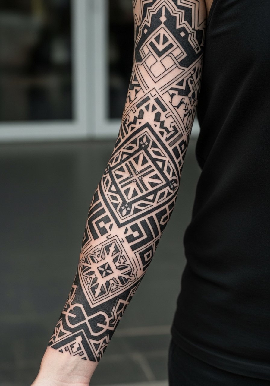Geometric sleeves read like modern cathedral plans. I saw a few that wrap the arm in repeating arches and they aged well because the shapes were large. Pain varies across the arm. Expect multiple sessions across months. Tell your artist you want consistent line rhythm and room between shapes. The common mistake is over-fragmenting the sleeve into many tiny polygons. Those elements fuse into noise by year two. When done with large forms, geometric sleeves stay readable and dramatic.