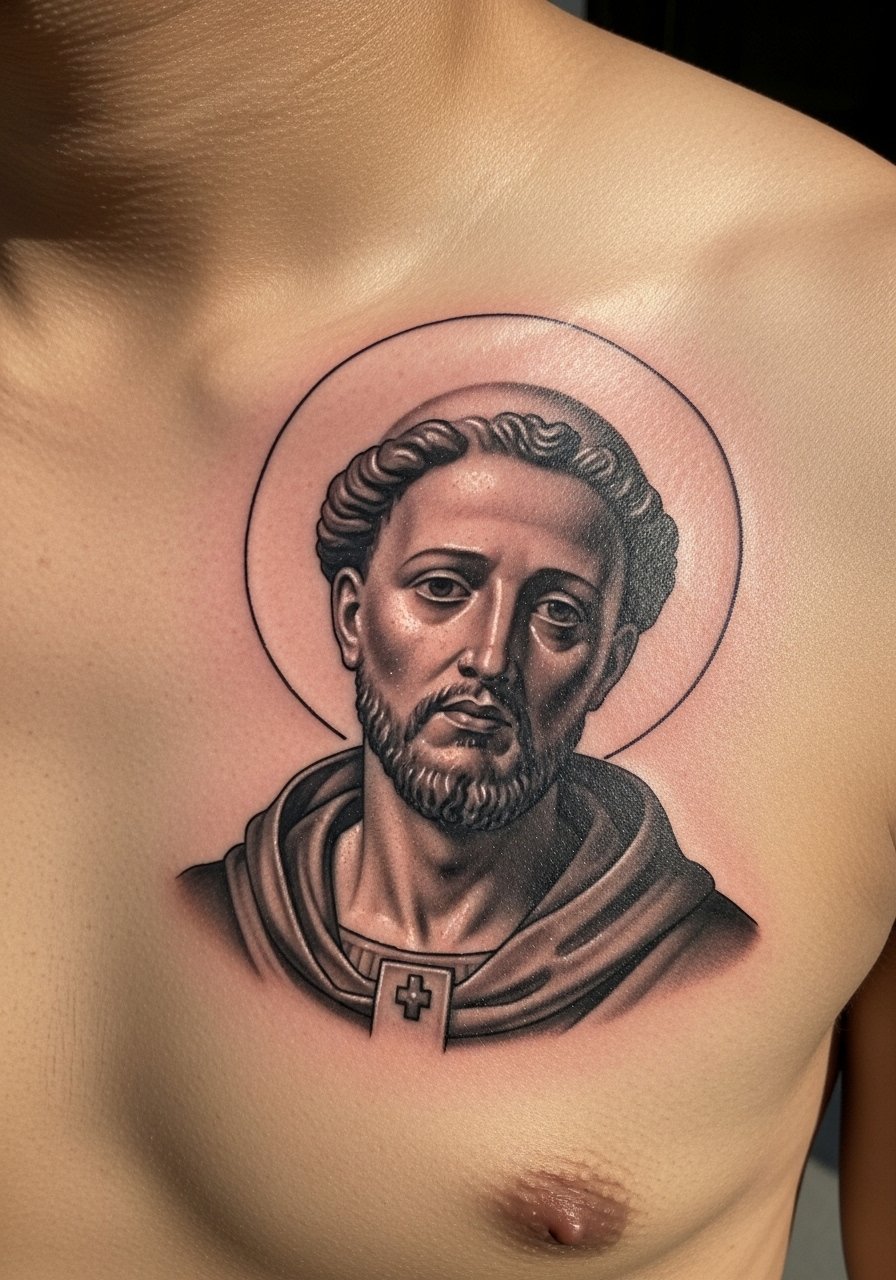 Portraits read as narrative on the chest. I recommend micro-realism for folks who want recognizable features. The chest can be tender near the sternum, pain a 6. Large portraits take multiple long sessions. Tell your artist to prioritize strong, simplified planes rather than endless tiny hairlines. Too much micro-detail in early sessions makes touch-ups harder. Around two years portraits need touch-ups to maintain high contrast. For a gothic saint, keep the surrounding negative space moody to let the face pop.