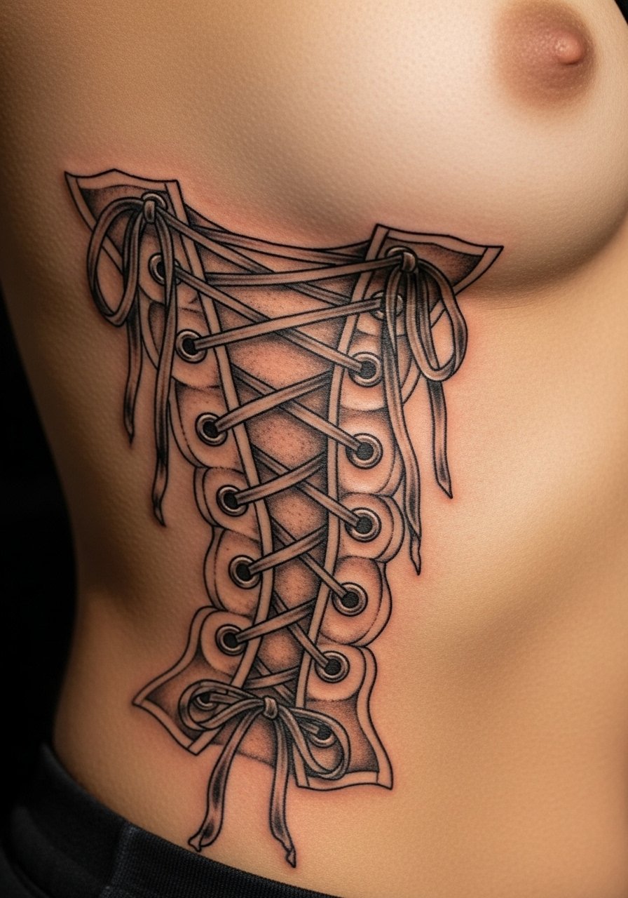 I first saw corset lacing in vintage fashion edits and then on skin. This illusion works because it follows the rib curve. Pain rates high across ribs. Short, staggered sessions help. Tell the artist to space eyelets and knots so they remain distinct after healing. A common mistake is placing tiny stitches too close. They blur into a dark line as the skin shifts. When spaced properly, the lacing ages gracefully and keeps the illusion of depth long term.