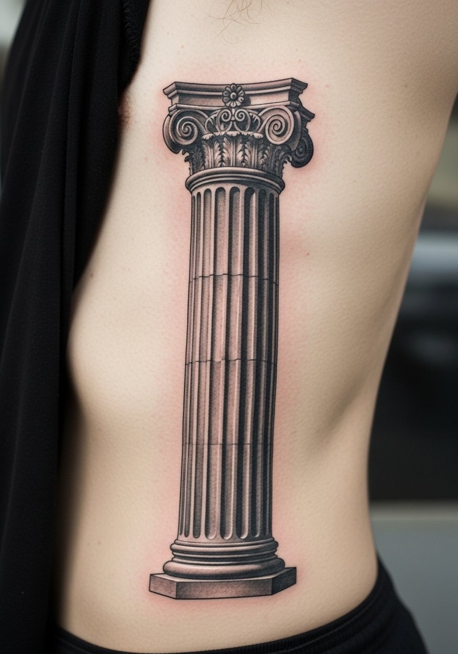 There is something about a column that anchors a body visually. Side torso work hurts more when close to the hip. Pain average is 6. Ask the artist to emphasize shadow planes and avoid tiny fluting lines that later wash out. The mistake I see is using print-scale fluting on curved, moving skin. Over time the column should still read structural because of strong contrast and simplified details. Expect full character by six to nine months.