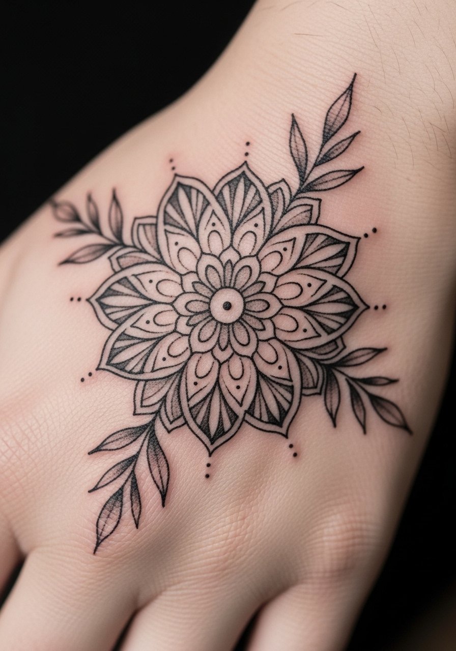 Back-of-hand mandalas give that classic henna focal point without covering the whole palm. The symmetry reads well and small leaf sprays soften the edge. Hands are higher-movement areas, so expect a bit more sting and slightly longer surface healing. From what I’ve seen, dotwork and mandala lines can hold up nicely if the artist balances detail with slightly bolder anchor lines. Common mistake: packing too much tiny detail that blurs—opt for readable modules. This is a great place to test a mandala that might become a centerpiece in a future sleeve.