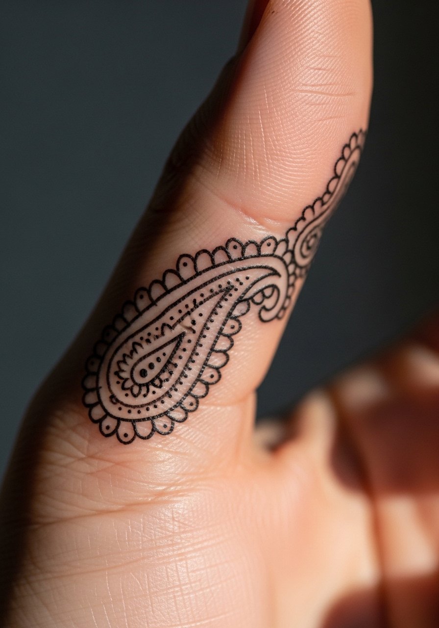 Thumb wraps channel South Asian paisley motifs in a compact, tactile space. Fingers and thumbs move a lot, so expect more touch-ups historically, but a clean paisley with clear outlines will age better than microfiligree. This placement is ideal if you want discreet henna-style tattoos that peek out while texting or holding a cup. Pain is higher than the outer forearm but manageable for short sessions. Tip: ask the artist to slightly thicken outer lines to help the piece stay crisp over time.