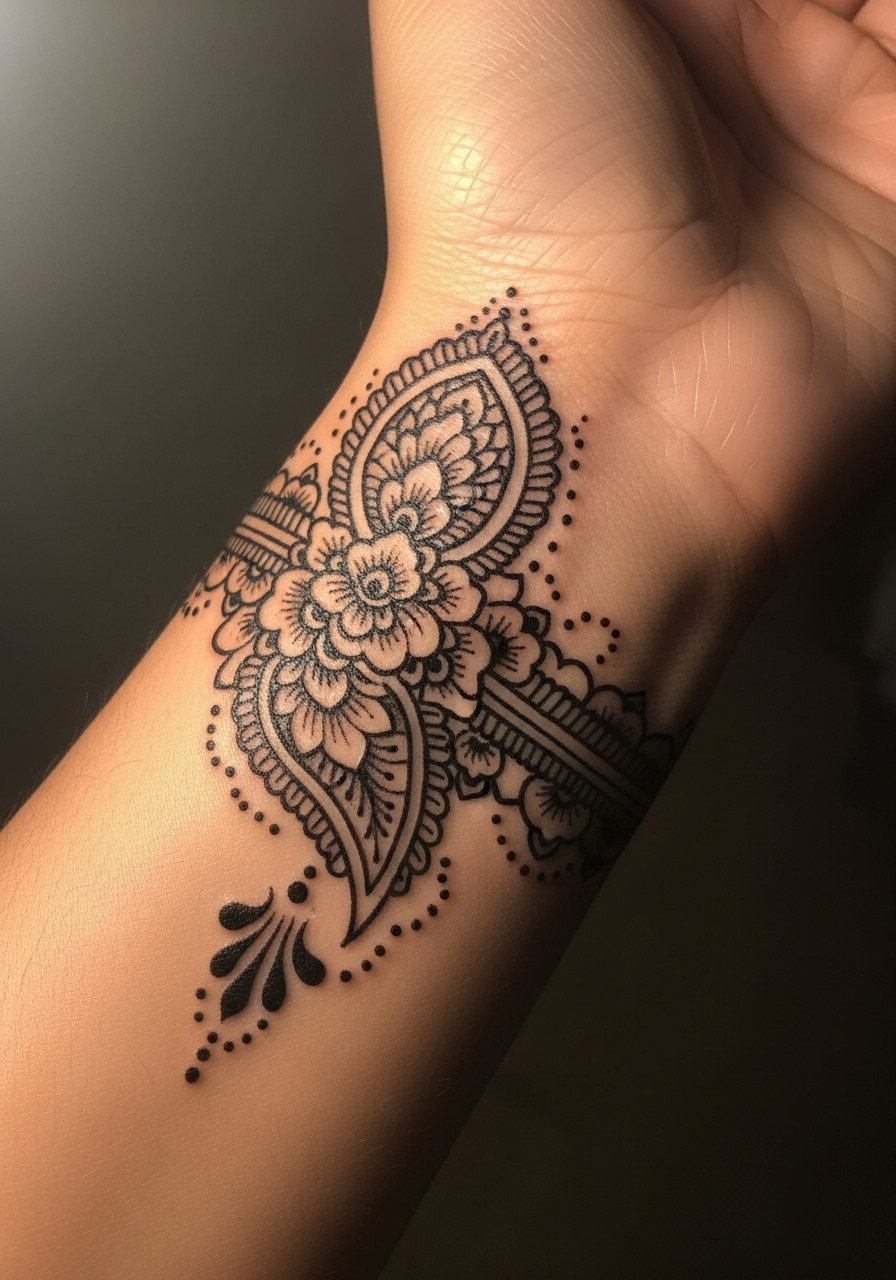 Modern fusion bracelets mix paisley, petals, and geometric nodes into a band that reads like delicate jewelry. I’ve seen these across Pinterest and tattoo reels—artists often use stencil templates for symmetry. Ideal for those who want a consistent accessory without actual jewelry. Healing is straightforward; keep hand washing gentle. This is an office-friendly henna-style tattoo that balances detail and readability.