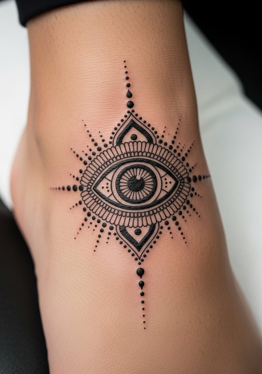 Gulf-style fills and protective symbols like the evil eye are under-covered but powerful henna-style options. Instep placement reads traditional and can peek out of shoes. Feet require care during healing—limit tight footwear and long walks. The look pairs bold central motifs with dot-and-dash fills; ask your artist to avoid tiny hatch fills that blur quickly. Symbolically, it’s a strong option if you want cultural resonance without full bridal patterns.