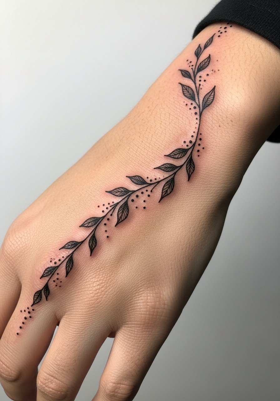A connecting vine from thumb to wrist mimics bridal henna flow but stops short of full coverage. It feels like wearing a delicate hand chain. Expect mixed pain across areas—thumb base is more sensitive than flat wrist skin. Healing requires gentle movement and moisturizer. This is a good compromise if you like full-hand patterns but want to keep things minimal and wearably casual.