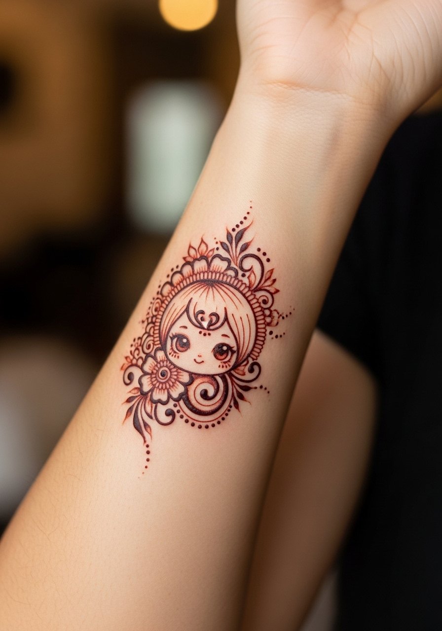 I’ve seen pop-culture henna designs—think tiny character outlines with henna-styled filigree—work great as fun experiments. Inner forearm is a forgiving canvas: visible but easily covered. Artists can fuse illustrative shading with henna dot borders for a fresh mix. Keep it small and simple to avoid early blurring. This is a playful path if you want a trendy motif that nods to henna without being culturally prescriptive.