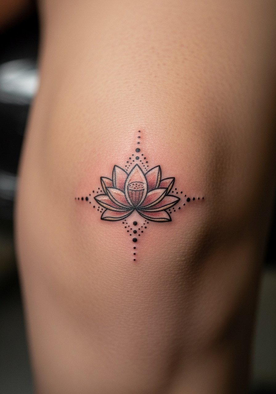 A tiny lotus behind the knee is an unusual henna-style spot that feels private and meaningful. Behind-knee skin creases; expect movement during healing and be cautious with workouts. The lotus reads well in small form and pairs nicely with leg hair patterns. It’s a subtle nod to floral henna meaning without occupying visible skin real estate.