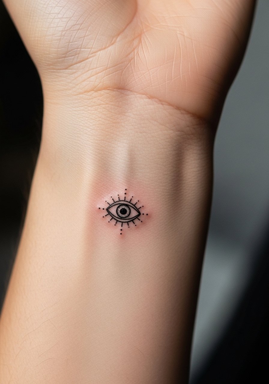 Tiny protective symbols like an evil eye on the inner wrist are discreet and meaningful. The area shows easily to the wearer and is simple to cover. Because it’s small, shading should be minimal; solid small black or navy centers with dot halos work best. From what I’ve noticed, micro-symbols here become a calming daily sight without being showy.
