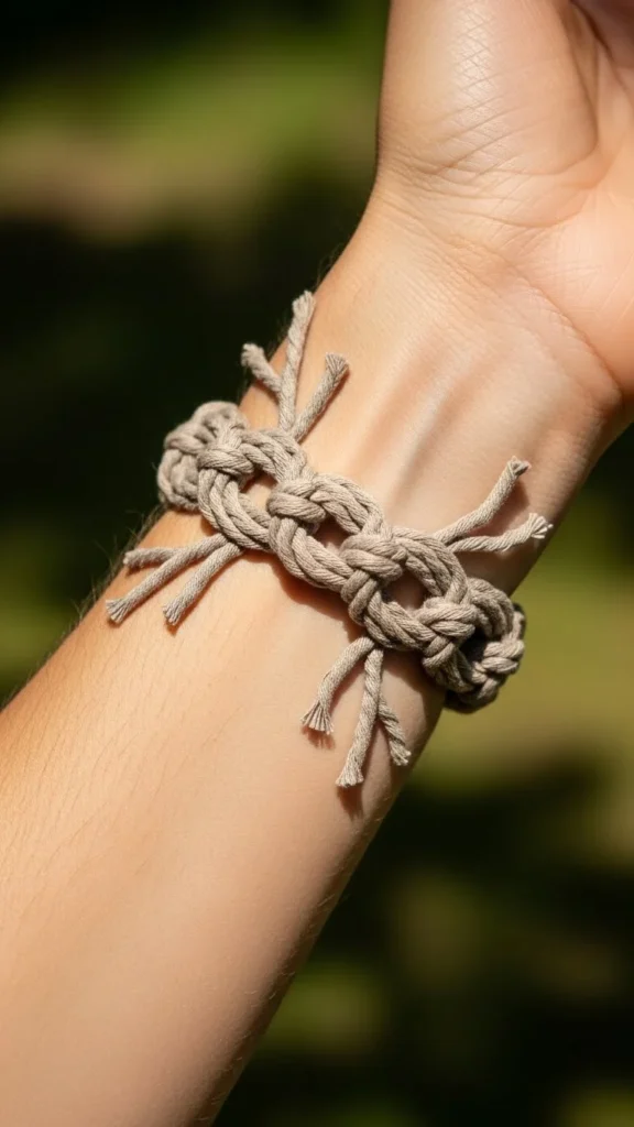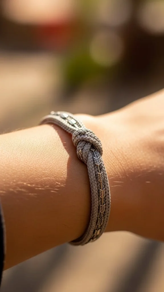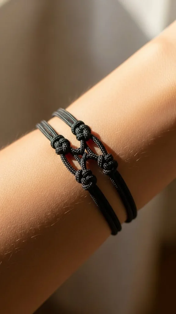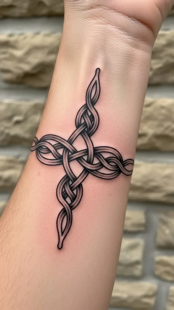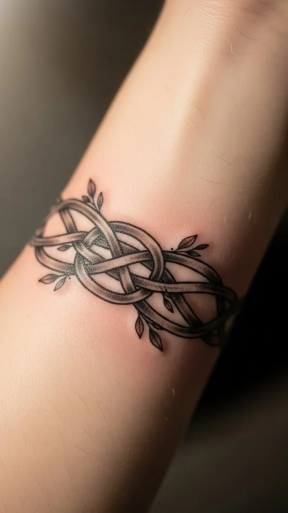 This style suits anyone who wants an uncomplicated knot concept. The loops circle the arm cleanly and feel steady without extra symbols. Keep the linework thin if you prefer a softer look. Bring a printout to your artist so the lines wrap correctly. For something affordable, ask for a single-line outline instead of shading. You can sketch your own loops using a marker on paper, then trace variations until you find one that feels balanced. A simple loop band is quick to tattoo, so it often fits smaller budgets.