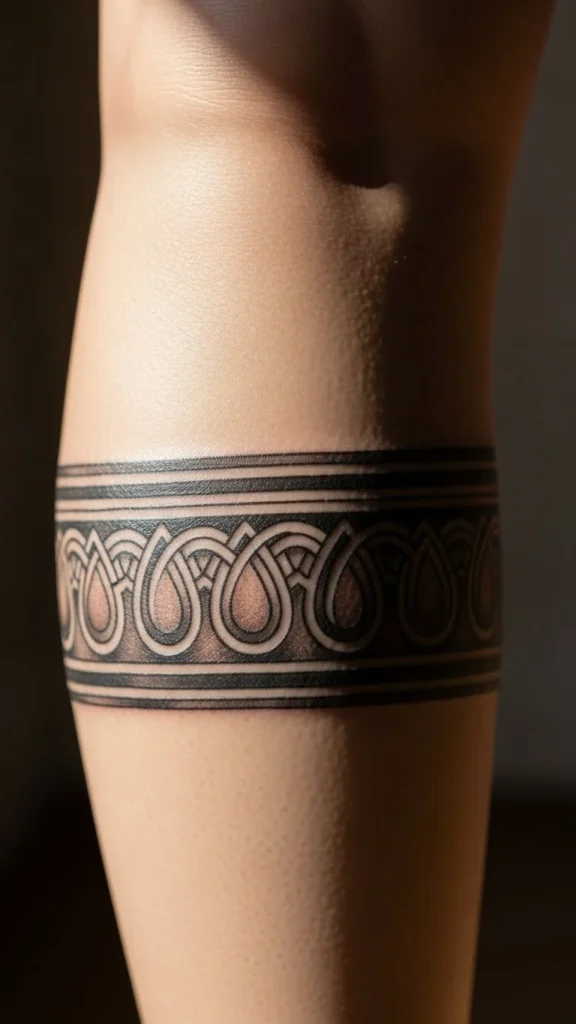 A double-band style creates a stacked look that feels balanced. You can repeat the same knot twice or use two different patterns. Keeping a small gap between the bands helps them stand out. If you want a lower price, choose line-only work on both bands. Create a paper strip and draw two lines to test spacing. This design works well on upper arms and calves. You can keep both bands equal in thickness for a tidy finish.