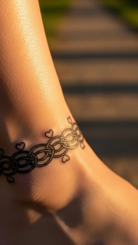 Spirals add movement to the knot theme. You can place one spiral at each repeat to keep things neat. Many artists enjoy adding small curls because they fill empty space without complicating the design. To keep the session short, stick to line work. Try drawing spirals freehand on a long strip of paper and match them to the knot loops. Once taped onto your ankle, you’ll see how the pattern flows. If it feels too busy, remove every other spiral.