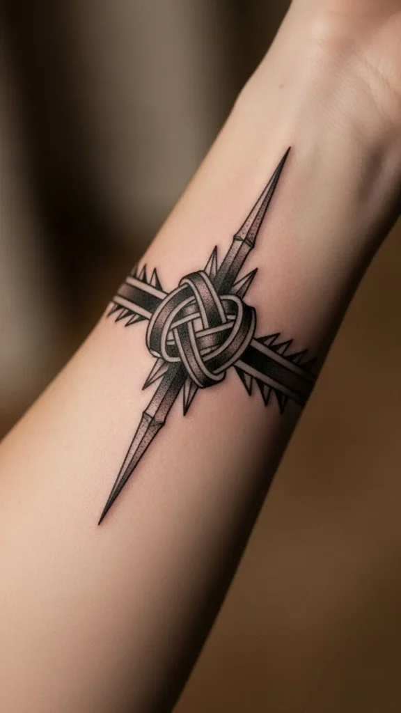 Arrows introduce direction into the pattern. Keep them small so the knot remains the main feature. You can point arrows forward or alternate directions. To keep the cost friendly, ask the artist to stick to thin outlines. At home, draw arrow shapes and test them along your knot sketch. Once wrapped in paper around your wrist, the flow becomes easier to judge.