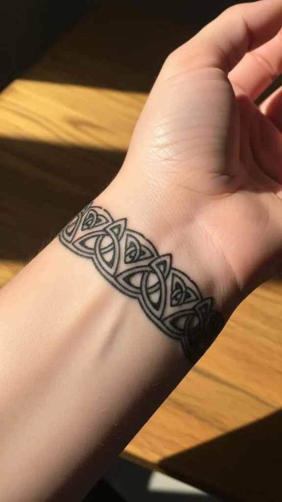 The Trinity symbol adds meaning without making the band look crowded. You can repeat the shape around the wrist or forearm for a clean wrap. Keep spacing even, which helps the pattern look smooth from all sides. If you want to reduce cost, focus on line-only work rather than shading. Practice drawing the triangle loops at home to see how large you want them. Tape a strip of paper around your wrist and sketch until the repeat looks even. Bring that strip to your artist as a reference.