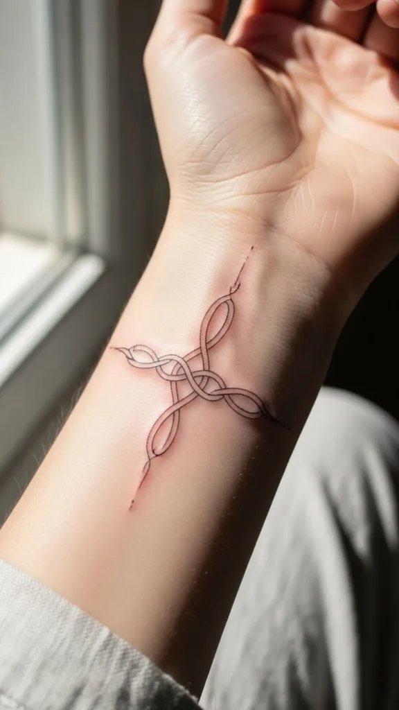 Thin lines suit anyone who likes quiet designs. They feel gentle and light on the skin. The knot pattern still creates interest without appearing heavy. Keep the loops simple so the thin lines stay clear. A design like this often costs less because it takes less ink. At home, you can sketch with a fine-tip pen and test loops of different sizes. When you find a pattern you like, print a few copies to check how it looks wrapped around your wrist.