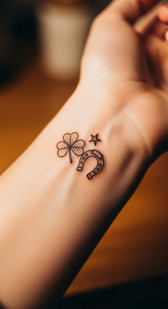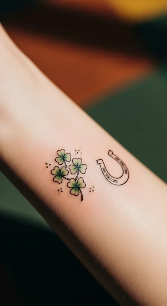A cluster of small lucky charms builds a warm, playful vibe. Each symbol adds meaning without dominating your skin. Start by choosing three to four icons you enjoy most. Shamrocks, horseshoes, stars, or even small Celtic knots blend nicely. Lay them out on paper to test spacing. You can ask your artist to place them like a tiny constellation. This design works great along the forearm or collarbone. Adding them one at a time over several visits makes the cost easier to handle. Keep each charm around the same size for balance. It’s also a fun DIY sketching project if you like trying out personal designs at home.
