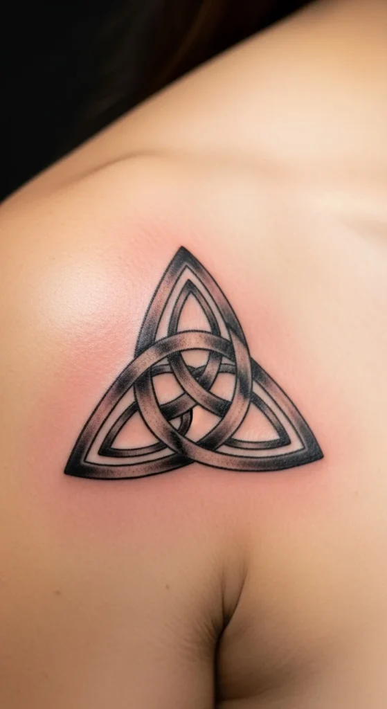 A Trinity knot symbolizes unity and balance, making it a steady choice for anyone who wants meaningful ink. Its simple triangular shape fits nearly anywhere. Draw a few versions at home to play with line thickness. Many people place it on the shoulder because the rounded area suits the curved pattern. Add a soft green accent line for a gentle Irish hint. You can also keep the design small to make the appointment quick and affordable. The clean geometry creates a polished look without extra detail.