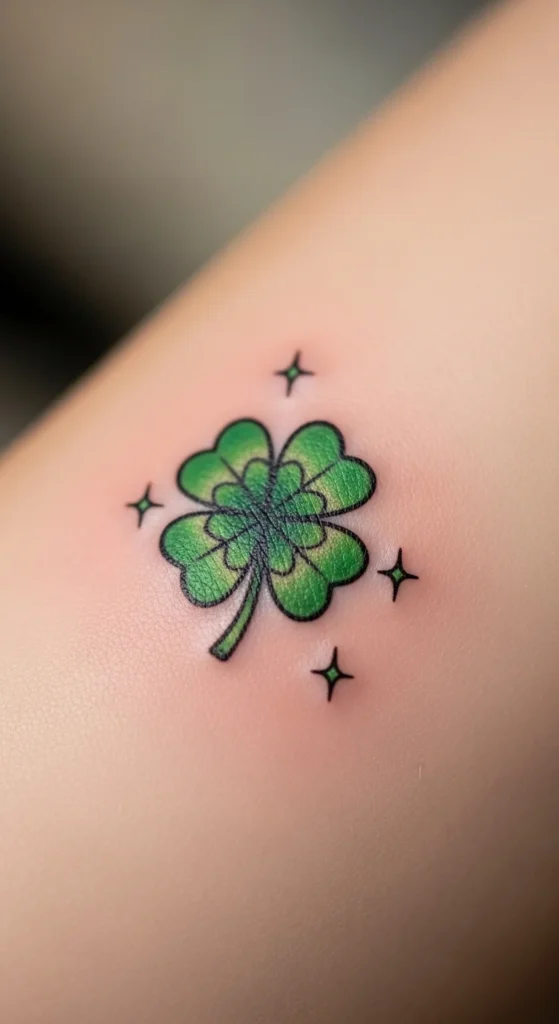 Adding sparkles gives a gentle, whimsical touch. You can arrange them around the clover in any direction. Try drawing small diamonds or dots to see what feels right. This look works well on the forearm or collarbone. Keeping the sparkles small helps the tattoo stay light. A faint green stroke can tie everything together. This design style is simple enough for beginners and perfect for anyone who wants something cheerful but minimal.