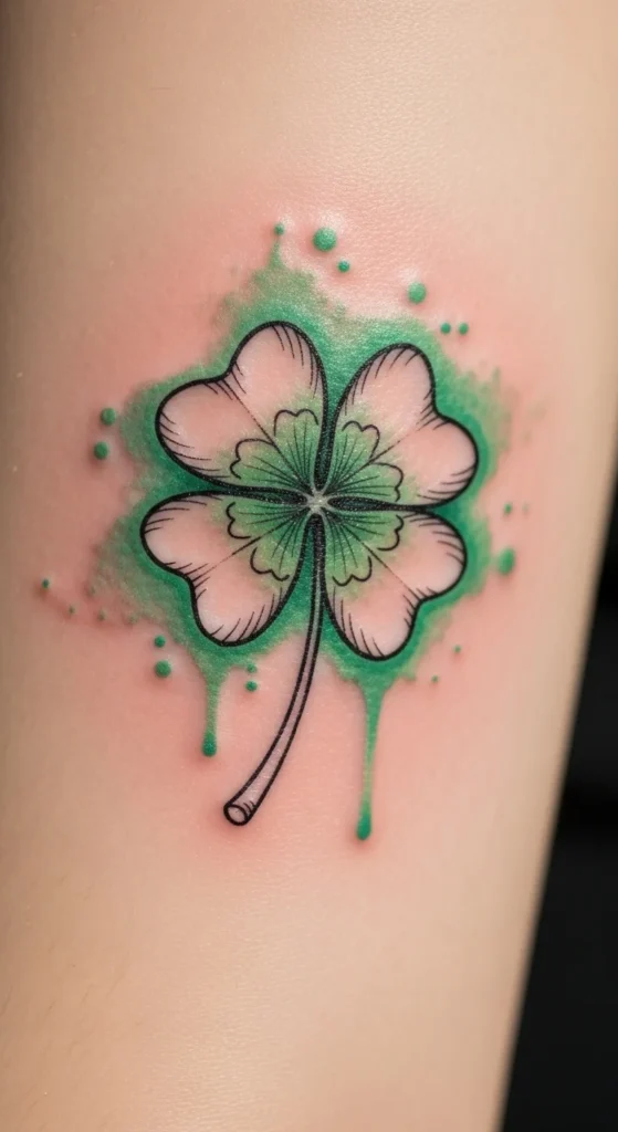 A watercolor splash adds energy while keeping the tattoo gentle. The clover stays simple, while the splash gives movement. Many people choose this style when they want something expressive but not overwhelming. If you’re testing looks at home, brush a bit of diluted watercolor behind a clover sketch to see if you enjoy the effect. This idea works best on the forearm or shoulder where there’s space for the splash. Keep the colors soft so the clover remains the focus.