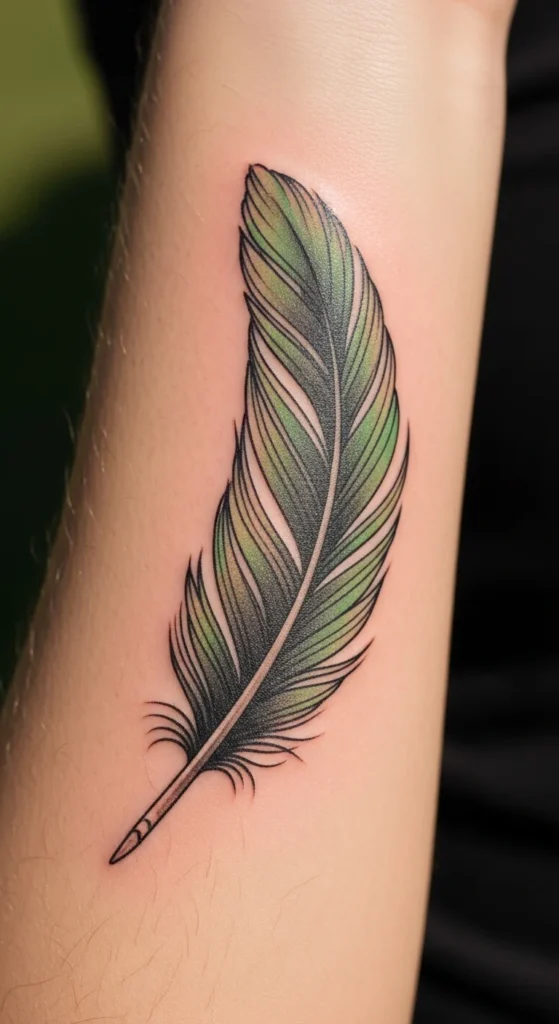 An Irish-inspired feather works well for someone who likes symbolic pieces that feel light. The green-tipped edges add a subtle nod to Irish charm. You can draw a simple feather outline at home and test how the curves look on your skin. This design stretches nicely along the forearm or outer thigh. Keep the lines fine to maintain a soft feel. You can even add a tiny clover hidden inside the feather for a personal twist.