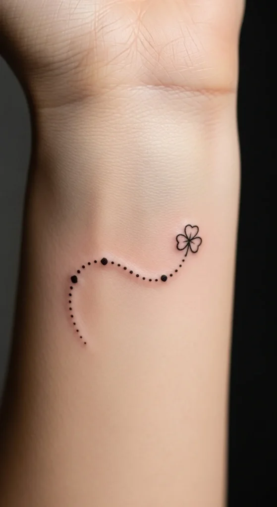 A dotted path creates a gentle flow on the skin. It’s subtle but symbolic in a friendly way. You can angle the dots along the forearm or curve them around the ankle. Add a small clover at the end to serve as the final “destination.” Try drawing dots with a pen to preview how the curve will look. The design is small, quick, and perfect for someone who likes minimal ink with meaning.