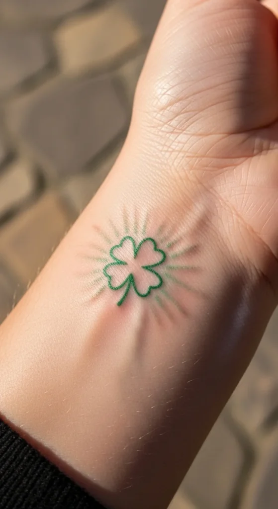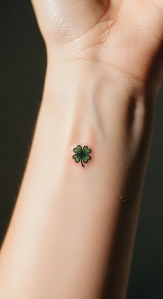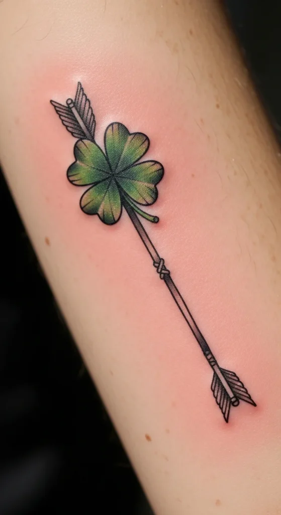 A slim arrow with a clover tip creates a forward-moving feel. It’s a nice idea if you want something that suggests progress or hope. You can keep the arrow very simple or add small decorative lines. Test the placement on your forearm using a washable pen. Many people choose black ink for the arrow and soft green for the clover. Keeping the shapes small also helps manage the cost and time.
