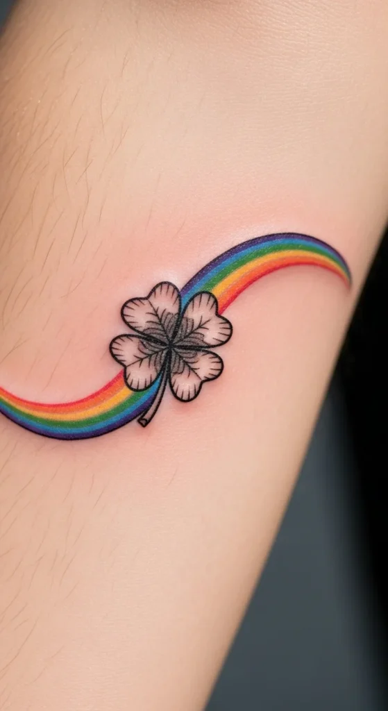 A tiny rainbow band adds color without feeling heavy. The clover stays center stage while the arc adds brightness. You can draw a simple line rainbow at home using colored pencils to test combinations. This design looks cute on the wrist, forearm, or shoulder. Keep the band narrow so the tattoo stays soft. If you prefer only a hint of color, ask your artist to fade the band gently.