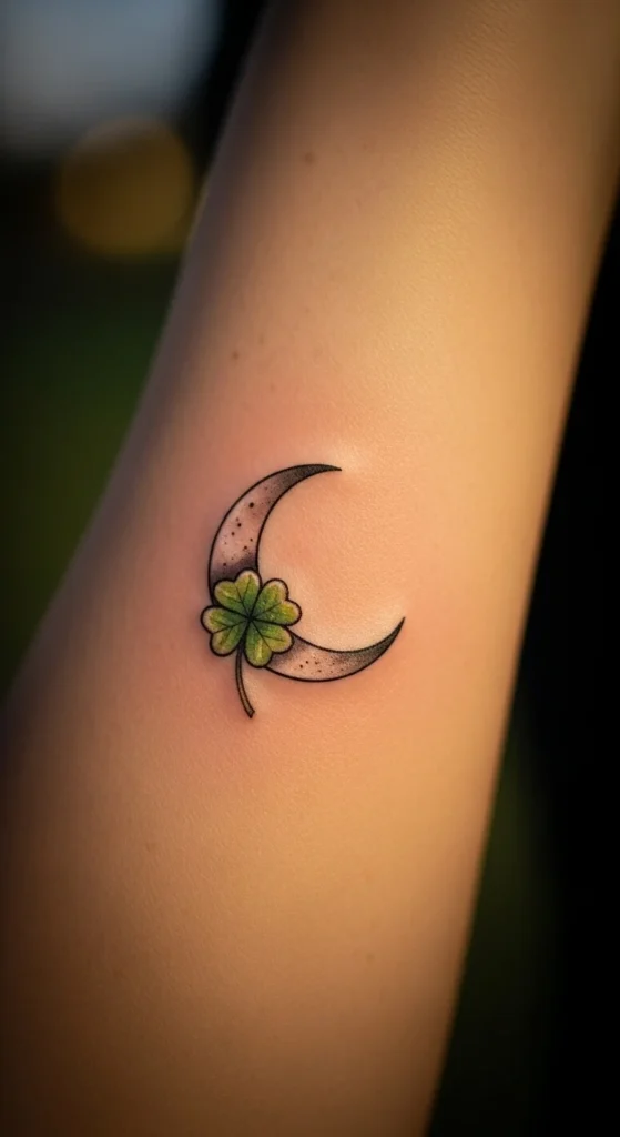 This pairing feels relaxing and thoughtful. The moon adds calm energy, while the clover gives it an Irish touch. You can keep both symbols very small so the tattoo stays discreet. Test placement near the wrist or rib area for a soft look. Draw the moon with a slight tilt to add personality. You can also outline the clover without shading for a lighter effect. It’s a sweet design that suits many styles.